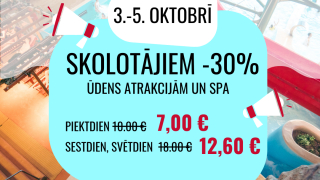 Godinot skolotājus viņu svētkos, Olimpiskais centrs “Ventspils” piedāvā visiem Ventspils skolotājiem iespēju šajā nedēļas nogalē - no 3.līdz 5. oktobrim. izmantot Ūdens piedzīvojumu parka Ūdens atrakciju un SPA zonas pakalpojumus ar 30% atlaidi.